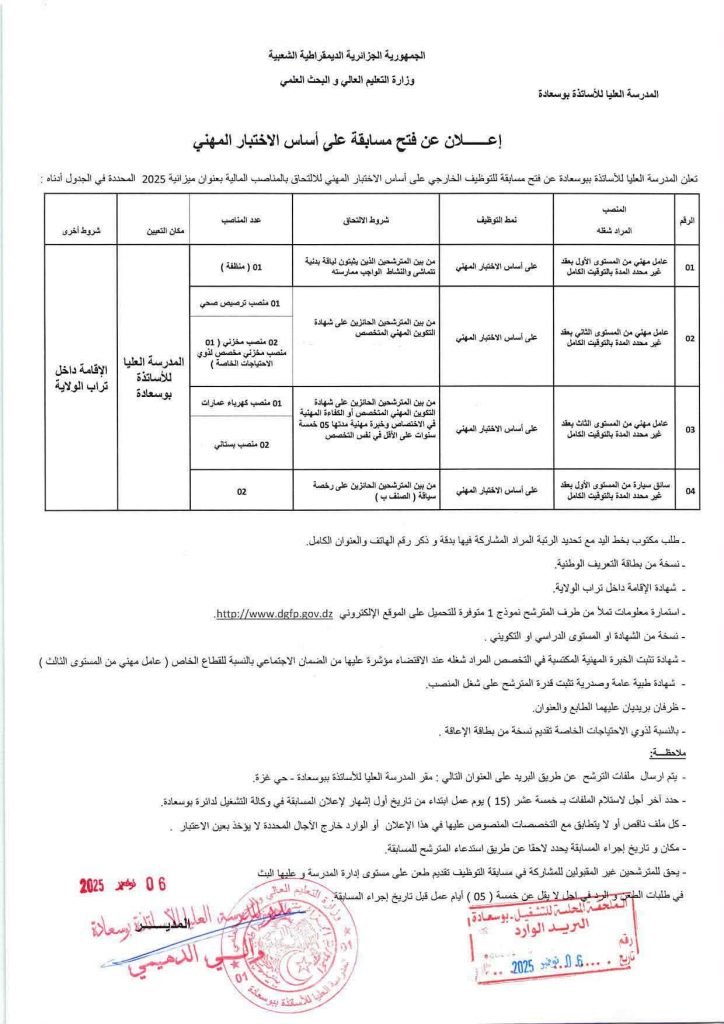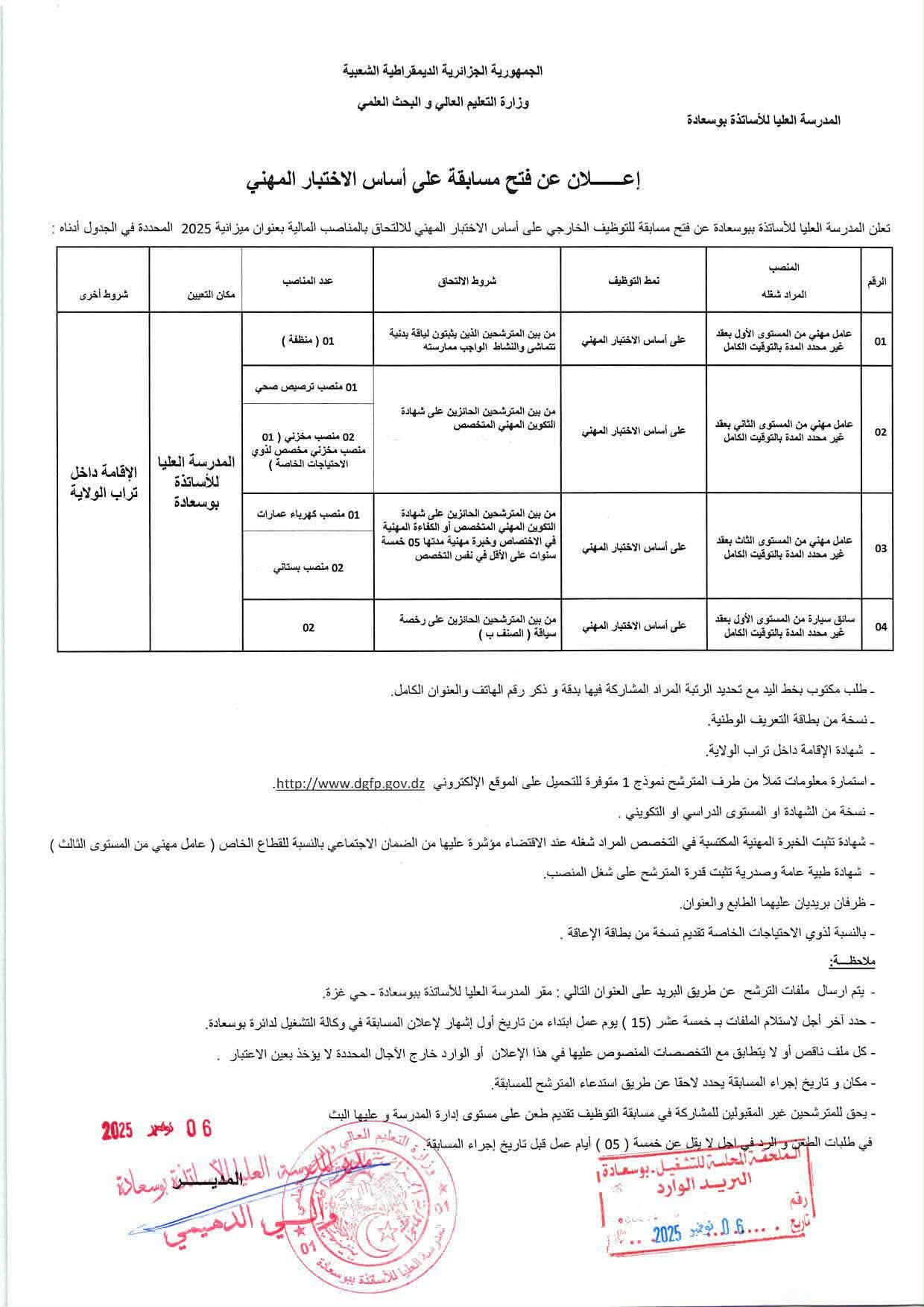 إعلان عن فتح مسابقة على أساس الإختبار المهنيmeme thameur6 نوفمبر، 2025غير مصنف إعلان عن فتح مسابقة على أساس الإختبار المهني…………………………………………………………………………….تنزيل الإعلان