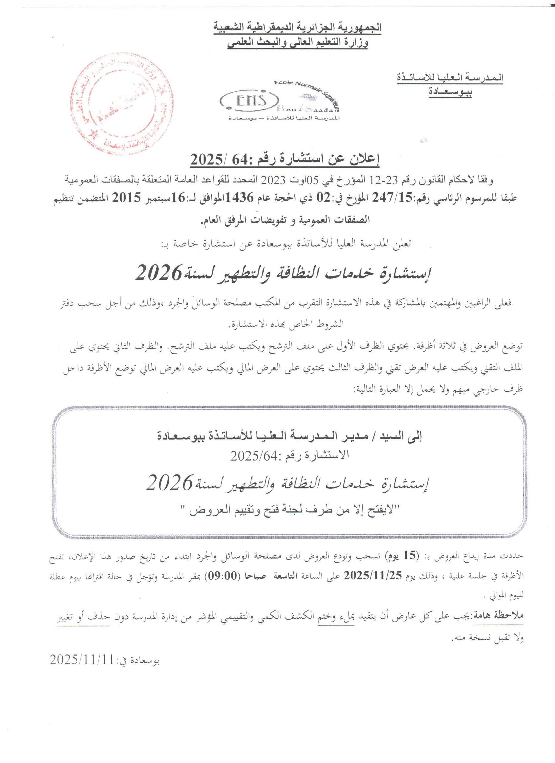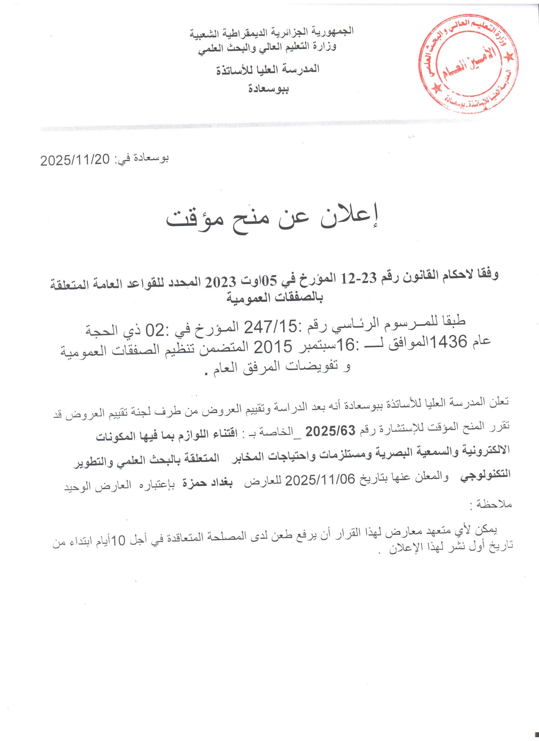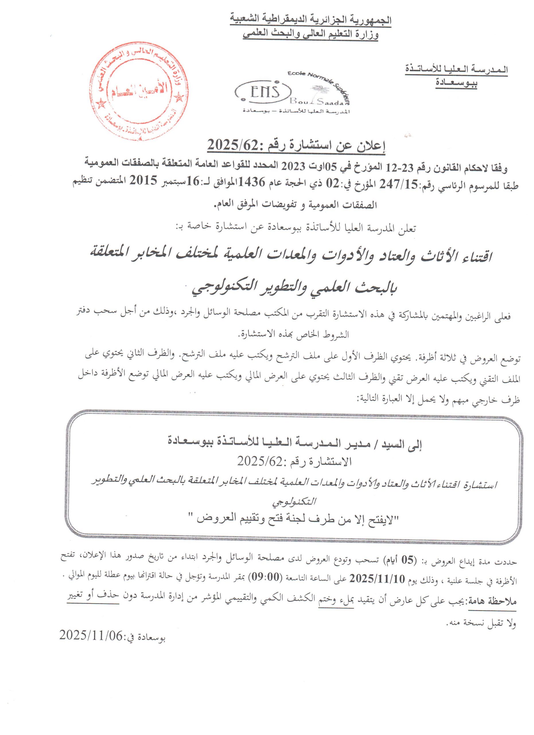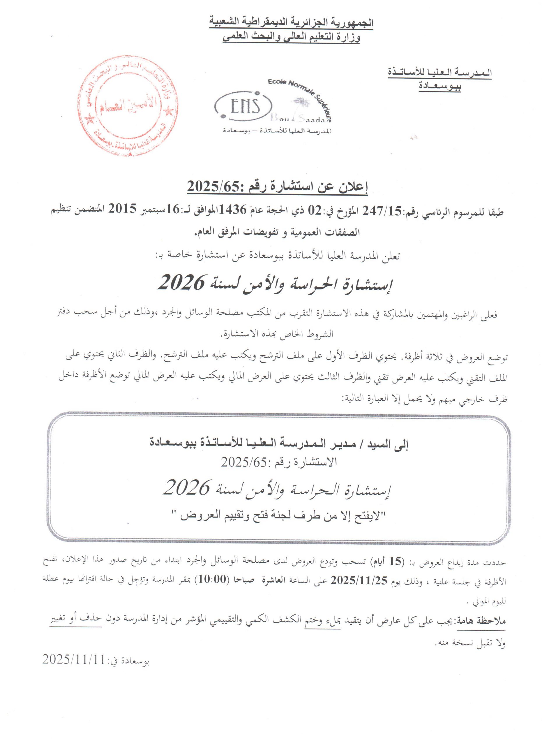 منح مؤقت : إستشارة رقم 69 : إقتناء كتب إستشارة رقم 68 : اقتناء قطع غيار سيارات الحظيرة إستشارة رقم 67 : إقتناء عتاد الاعلام الالي ومستهلكاته لمختلف مخابر البحث المتعلقة بالبحث العلمي والتطوير التكنولوجي الألي إستشارة رقم 66 : خدمات التأمين للممتلكات و العقارات لسنة 2026 إستشارة رقم 65 : خدمات الحراسة و الأمن لسنة 2026 إستشارة رقم 64 : خدمات النظافة و التطهير لسنة2026 إستشارة رقم 63 : اقتناء اعتاد الاعلام الالي ومستهلكاته لمختلف المخابر المتعلقة بالبحث العلمي والتطوير التكنولوجي إستشارة رقم 62 : اقتناء الأثاث و الأدوات و المعدات العلمية لمختلف المخابر المتعلقة بالبحث العلمي و التطوير التكنولوجي إستشارة رقم 58 : اقتناء اعتاد الاعلام الالي ومستهلكاته لمختلف المخابر المتعلقة بالبحث العلمي والتطوير التكنولوجي إستشارة رقم 56 : اقتناء مواد الصيانة والنظافة إستشارة رقم 55 : اقتناء عتاد الصيانة والاصلاح إستشارة رقم 54 : اقتناء عتاد طبي إستشارة رقم 53 : جلب اشجار للمساحات الخضراء إستشارة رقم 52 : اقتناء عتاد السمع البصري إستشارة رقم 51 : اقتناء عتاد واثاث المكتب إستشارة رقم 48 : اقتناء مستهلكات الاعلام الالي إستشارة رقم 47 : اقتناء عتاد الاعلام الالي إستشارة رقم 46 : اقتناء البسة العمال إستشارة رقم 45 : خدمات تكوين موظفين وتحسين المستوى إستشارة رقم 44 : : صيانة وتصليح عتاد البيداغوجيا إستشارة رقم 43 : اقتناء مواد ولوازم صيدلانية وكيميائية إستشارة رقم 42 : اقتناء مستهلكات المخابر اعلان-مسابقة-معمارية-رقم-01-2025 إستشارة رقم 39 : خدمات الإستقبال لمصاريف التسيير المتعلقة بالبحث العلمي و التطوير التكنولوجي إستشارة رقم 38 : خدمات الإيواء لمصاريف التسيير المتعلقة بالبحث العلمي و التطوير التكنولوجي إستشارة رقم 37 : خدمات الإطعام لمصاريف التسيير المتعلقة بالبحث العلمي و التطوير التكنولوجي إستشارة رقم 36 : خدمات الإيواء لمختلف التظاهرات العلمية و التقنية لسنة 2025 إستشارة رقم 35 : خدمات الإطعام لمختلف التظاهرات العلمية و التقنية لسنة 2025 إستشارة رقم 31 : الدعم الإمدادي لمختلف التظاهرات العلمية لسنة 2025 إستشارة رقم 30 : خدمة الطباعة و الإستنساخ لسنة 2025 إستشارة رقم 28 : إقتناء مختلف الرايات الوطنية لسنة 2025 إستشارة رقم 27 : اقتناء الاوراق و لوازم التدريس لسنة 2025 إستشارة رقم 26 : اقتناء الاوراق و لوازم المكتب لسنة 2025 إستشارة رقم 23 : إقتناء تذاكر السفر (الطائرة) 2025 إستشارة رقم 20 : اقتناء عتاد ومستهلكات النسخ و التصوير 2025 إستشارة رقم 19 : اشغال التهيئة لقاعة المحاضرات بالمدرسة العليا 2025 إستشارة رقم 18 : اقتناء تذاكر سفر ( الطائرة ) 2025 إستشارة رقم 17 : صيانة و تصليح عتاد الاعلام الالي 2025 إستشارة رقم 16 : صيانة و تصليح الاجهزة العلمية 2025 إستشارة رقم 15 : صيانة و تصليح عتاد النسخ و التصوير 2025 إستشارة رقم 14 : صيانة و تصليح عتاد السمع البصري 2025 إستشارة رقم 13 : نقل الطلبة لمختلف النشاطات للنوادي العلمية 2025 إستشارة رقم 12 : جوائز لمسابقات و التظاهرات 2025 إستشارة رقم 11 : لوازم لمختلف النشاطات الثقافية 2025 إستشارة رقم 10 : اقتناء مختلف اللوازم الرياضية 2025 إلغاء المنح مؤقت : إستشارة رقم 58 : اقتناء عتاد الاعلام الآلي و مستهلكاته لمختلف المخابر المتعلقة بالبحث العلمي عدم جدوى : إستشارة رقم 61 : اقتناء عجلات لحضيرة المدرسة إستشارة رقم 60 : اقتناء الكتب إستشارة رقم 59 : اقتناء االلوازم بما فيها المكونات الالكترونية والسمعية البصرية ومستلزمات و احتياجات المخابر المتعلقة بالبحث العلمي والتطوير التكنولوجي إستشارة رقم 57 : اقتناء الاثاث والعتاد والادوات والمعدات العلمية لمختلف المخابر المتعلقة بالبحث العلمي والتطوير التكنولوجي إستشارة رقم 50 : إقتناء عتاد السمعي البصري لسنة 2025 إستشارة رقم 49 : إقتناء عتاد و أثاث مكتب لسنة 2025 إستشارة رقم 34 : خدمات تكوين الموظفين و تحسين المستوى المهني لسنة 2025 إستشارة رقم 33 : إقتناء عتاد السمع البصري 2025 إستشارة رقم 32 : صيانة و تصليح أثاث 