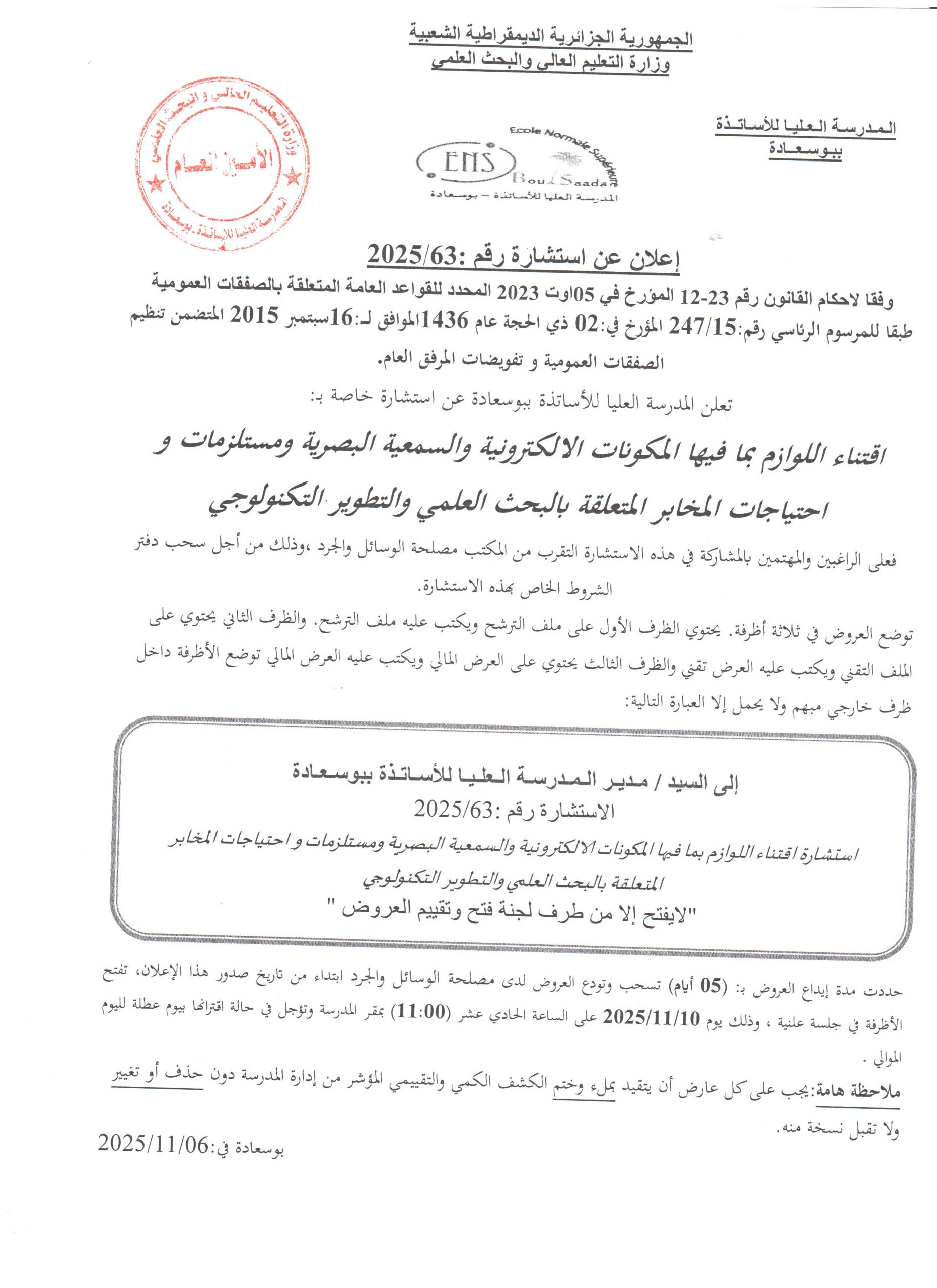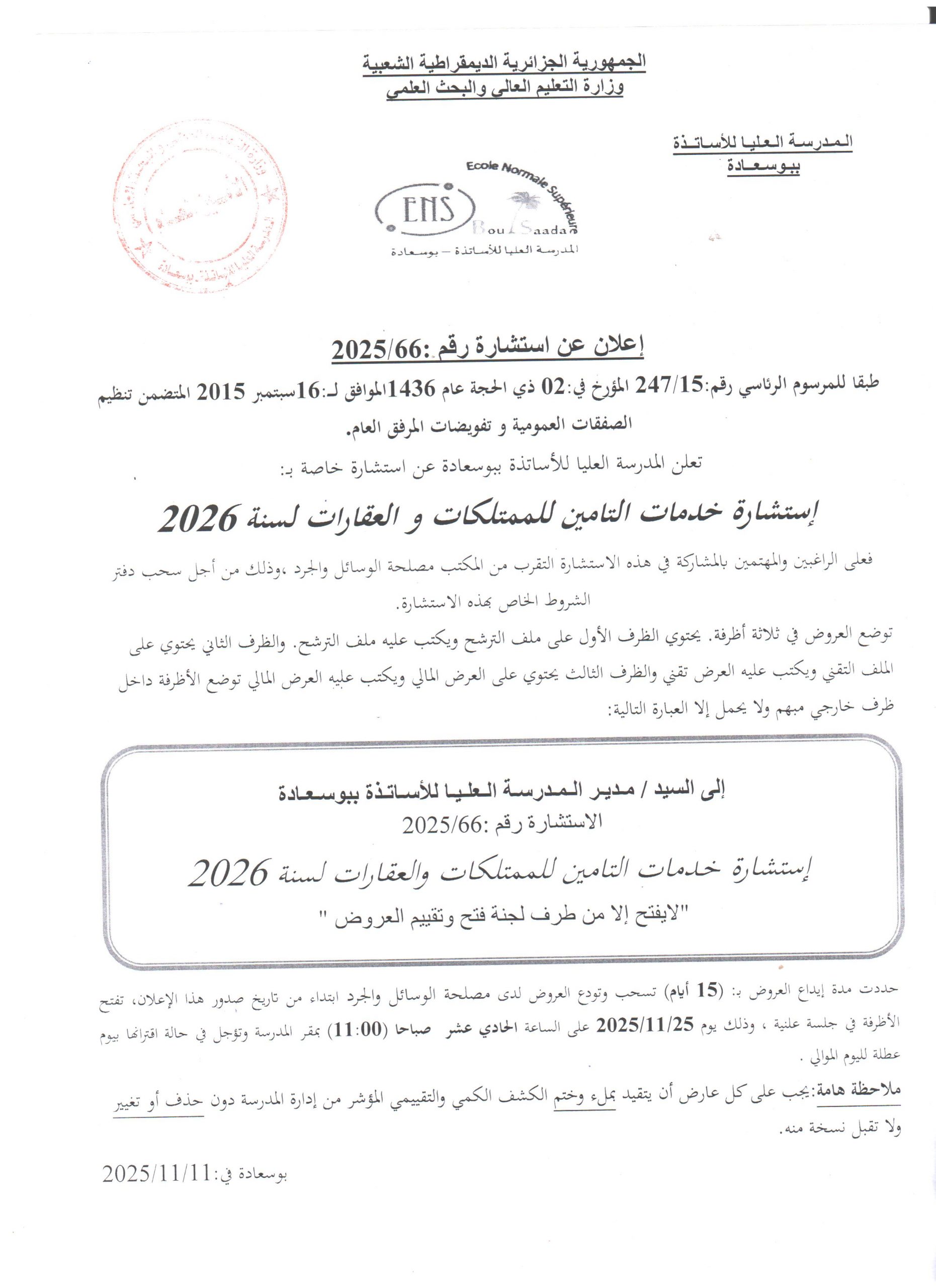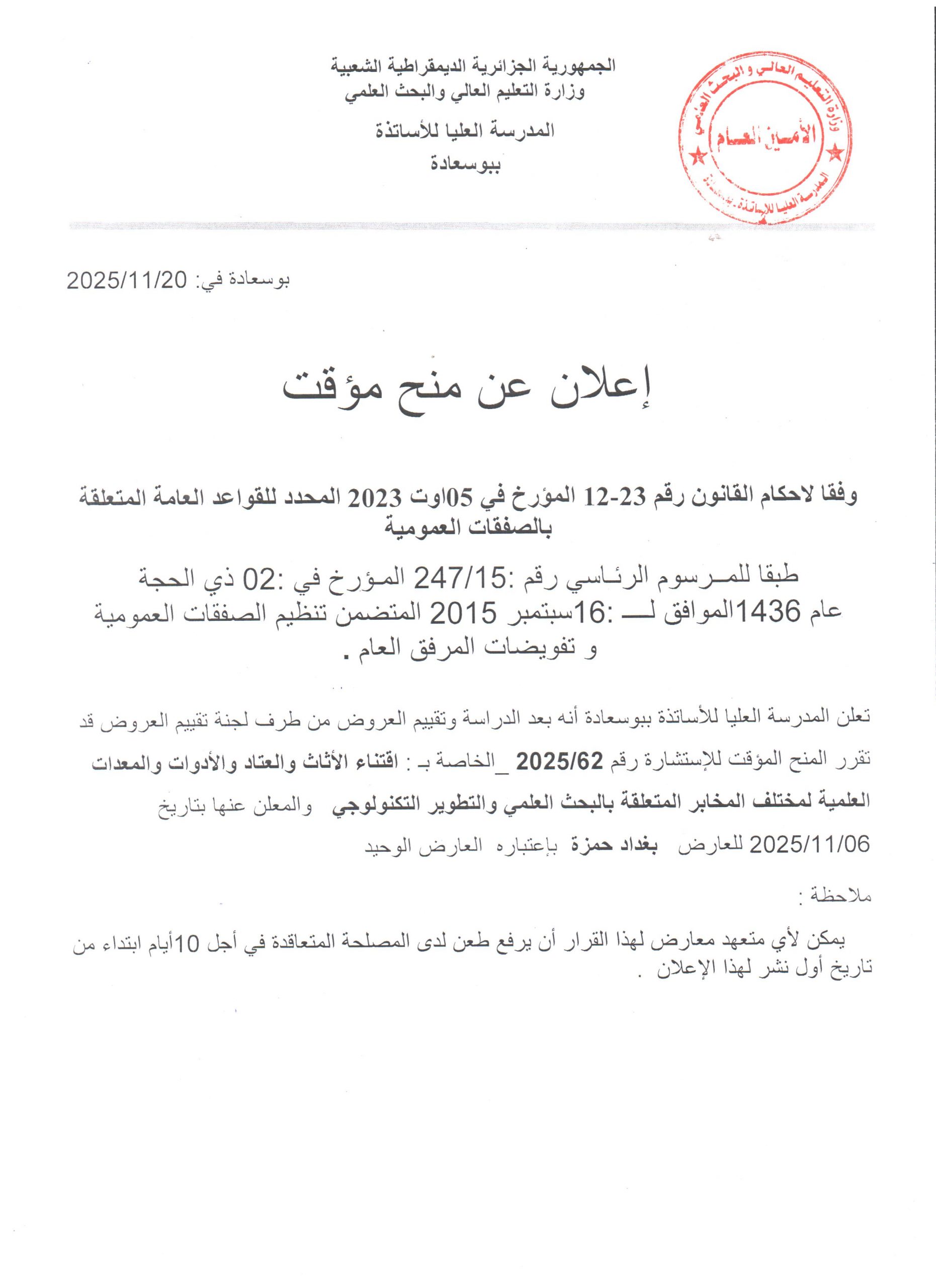 منح مؤقت : إستشارة رقم 69 : إقتناء كتب إستشارة رقم 68 : اقتناء قطع غيار سيارات الحظيرة إستشارة رقم 67 : إقتناء عتاد الاعلام الالي ومستهلكاته لمختلف مخابر البحث المتعلقة بالبحث العلمي والتطوير التكنولوجي الألي إستشارة رقم 66 : خدمات التأمين للممتلكات و العقارات لسنة 2026 إستشارة رقم 65 : خدمات الحراسة و الأمن لسنة 2026 إستشارة رقم 64 : خدمات النظافة و التطهير لسنة2026 إستشارة رقم 63 : اقتناء اعتاد الاعلام الالي ومستهلكاته لمختلف المخابر المتعلقة بالبحث العلمي والتطوير التكنولوجي إستشارة رقم 62 : اقتناء الأثاث و الأدوات و المعدات العلمية لمختلف المخابر المتعلقة بالبحث العلمي و التطوير التكنولوجي إستشارة رقم 58 : اقتناء اعتاد الاعلام الالي ومستهلكاته لمختلف المخابر المتعلقة بالبحث العلمي والتطوير التكنولوجي إستشارة رقم 56 : اقتناء مواد الصيانة والنظافة إستشارة رقم 55 : اقتناء عتاد الصيانة والاصلاح إستشارة رقم 54 : اقتناء عتاد طبي إستشارة رقم 53 : جلب اشجار للمساحات الخضراء إستشارة رقم 52 : اقتناء عتاد السمع البصري إستشارة رقم 51 : اقتناء عتاد واثاث المكتب إستشارة رقم 48 : اقتناء مستهلكات الاعلام الالي إستشارة رقم 47 : اقتناء عتاد الاعلام الالي إستشارة رقم 46 : اقتناء البسة العمال إستشارة رقم 45 : خدمات تكوين موظفين وتحسين المستوى إستشارة رقم 44 : : صيانة وتصليح عتاد البيداغوجيا إستشارة رقم 43 : اقتناء مواد ولوازم صيدلانية وكيميائية إستشارة رقم 42 : اقتناء مستهلكات المخابر اعلان-مسابقة-معمارية-رقم-01-2025 إستشارة رقم 39 : خدمات الإستقبال لمصاريف التسيير المتعلقة بالبحث العلمي و التطوير التكنولوجي إستشارة رقم 38 : خدمات الإيواء لمصاريف التسيير المتعلقة بالبحث العلمي و التطوير التكنولوجي إستشارة رقم 37 : خدمات الإطعام لمصاريف التسيير المتعلقة بالبحث العلمي و التطوير التكنولوجي إستشارة رقم 36 : خدمات الإيواء لمختلف التظاهرات العلمية و التقنية لسنة 2025 إستشارة رقم 35 : خدمات الإطعام لمختلف التظاهرات العلمية و التقنية لسنة 2025 إستشارة رقم 31 : الدعم الإمدادي لمختلف التظاهرات العلمية لسنة 2025 إستشارة رقم 30 : خدمة الطباعة و الإستنساخ لسنة 2025 إستشارة رقم 28 : إقتناء مختلف الرايات الوطنية لسنة 2025 إستشارة رقم 27 : اقتناء الاوراق و لوازم التدريس لسنة 2025 إستشارة رقم 26 : اقتناء الاوراق و لوازم المكتب لسنة 2025 إستشارة رقم 23 : إقتناء تذاكر السفر (الطائرة) 2025 إستشارة رقم 20 : اقتناء عتاد ومستهلكات النسخ و التصوير 2025 إستشارة رقم 19 : اشغال التهيئة لقاعة المحاضرات بالمدرسة العليا 2025 إستشارة رقم 18 : اقتناء تذاكر سفر ( الطائرة ) 2025 إستشارة رقم 17 : صيانة و تصليح عتاد الاعلام الالي 2025 إستشارة رقم 16 : صيانة و تصليح الاجهزة العلمية 2025 إستشارة رقم 15 : صيانة و تصليح عتاد النسخ و التصوير 2025 إستشارة رقم 14 : صيانة و تصليح عتاد السمع البصري 2025 إستشارة رقم 13 : نقل الطلبة لمختلف النشاطات للنوادي العلمية 2025 إستشارة رقم 12 : جوائز لمسابقات و التظاهرات 2025 إستشارة رقم 11 : لوازم لمختلف النشاطات الثقافية 2025 إستشارة رقم 10 : اقتناء مختلف اللوازم الرياضية 2025 إلغاء المنح مؤقت : إستشارة رقم 58 : اقتناء عتاد الاعلام الآلي و مستهلكاته لمختلف المخابر المتعلقة بالبحث العلمي عدم جدوى : إستشارة رقم 61 : اقتناء عجلات لحضيرة المدرسة إستشارة رقم 60 : اقتناء الكتب إستشارة رقم 59 : اقتناء االلوازم بما فيها المكونات الالكترونية والسمعية البصرية ومستلزمات و احتياجات المخابر المتعلقة بالبحث العلمي والتطوير التكنولوجي إستشارة رقم 57 : اقتناء الاثاث والعتاد والادوات والمعدات العلمية لمختلف المخابر المتعلقة بالبحث العلمي والتطوير التكنولوجي إستشارة رقم 50 : إقتناء عتاد السمعي البصري لسنة 2025 إستشارة رقم 49 : إقتناء عتاد و أثاث مكتب لسنة 2025 إستشارة رقم 34 : خدمات تكوين الموظفين و تحسين المستوى المهني لسنة 2025 إستشارة رقم 33 : إقتناء عتاد السمع البصري 2025 إستشارة رقم 32 : صيانة و تصليح أثاث 