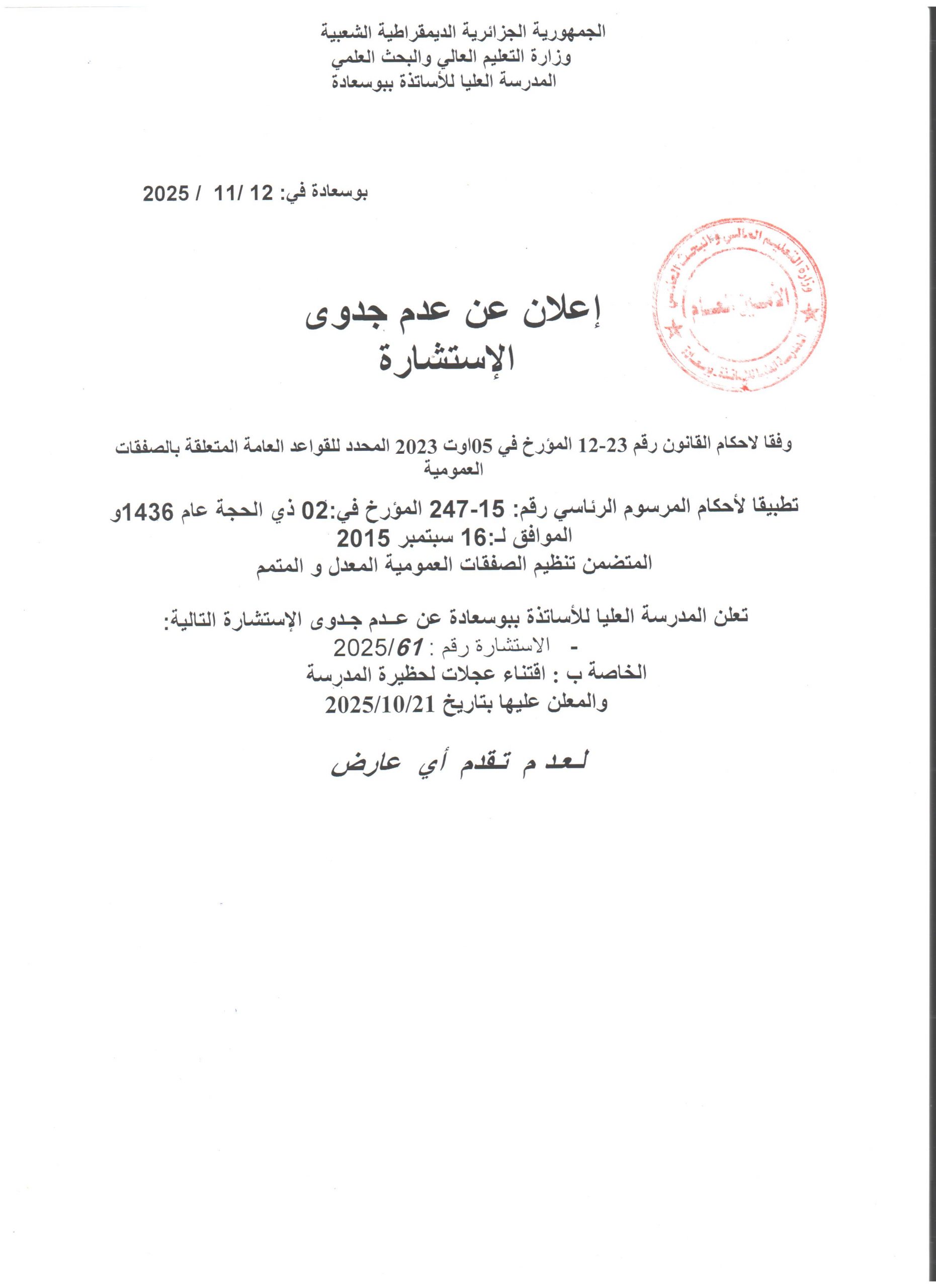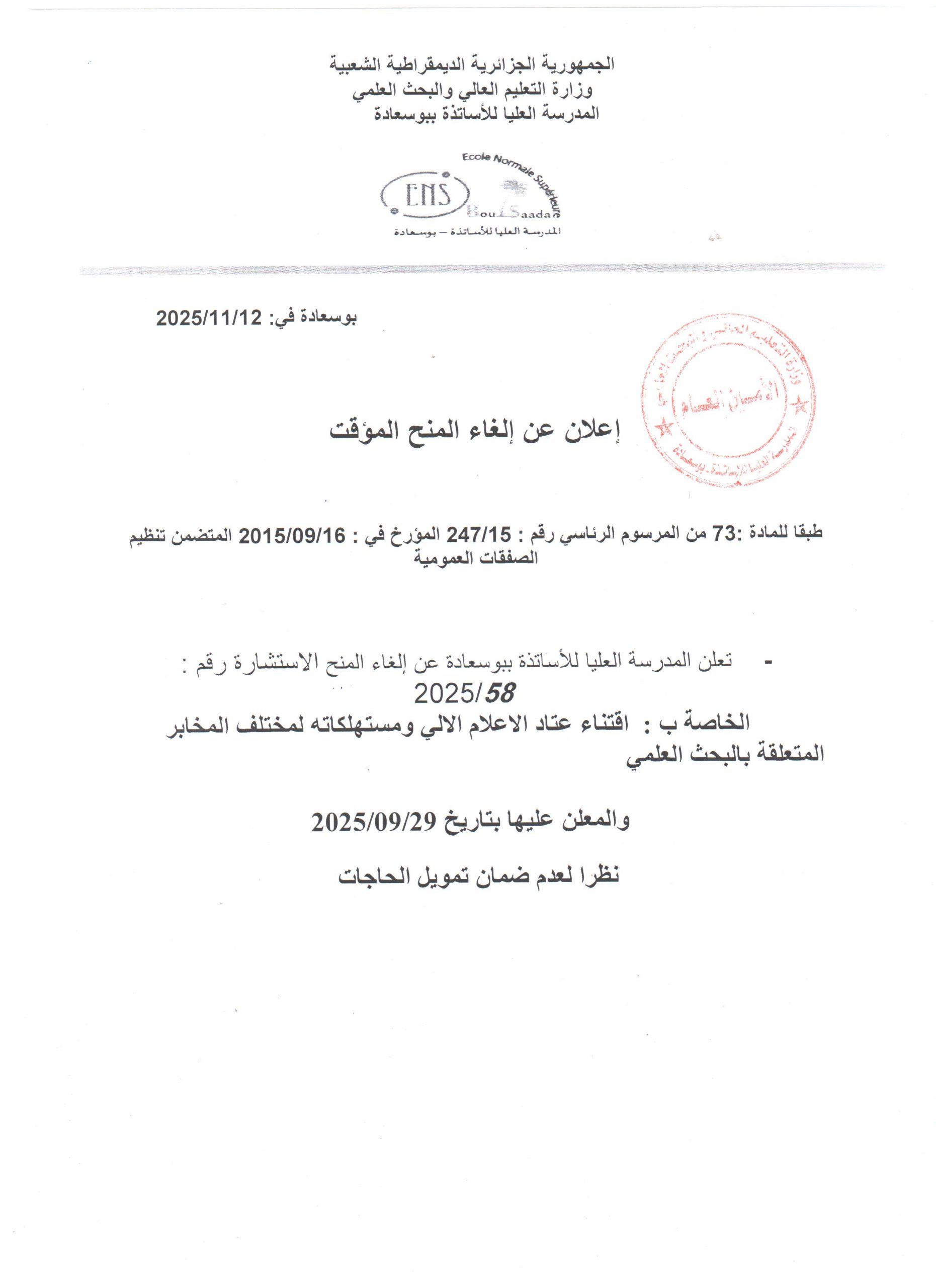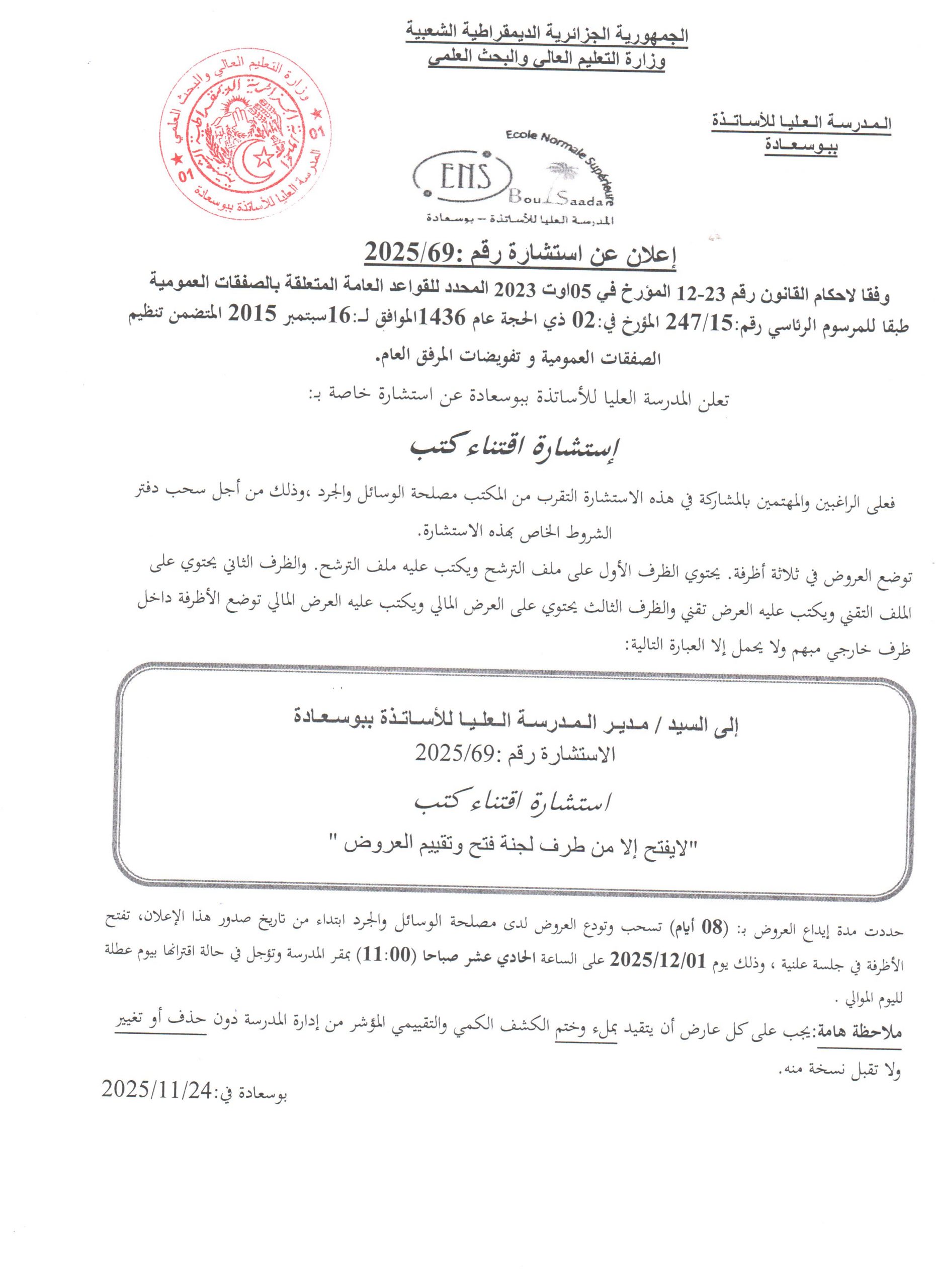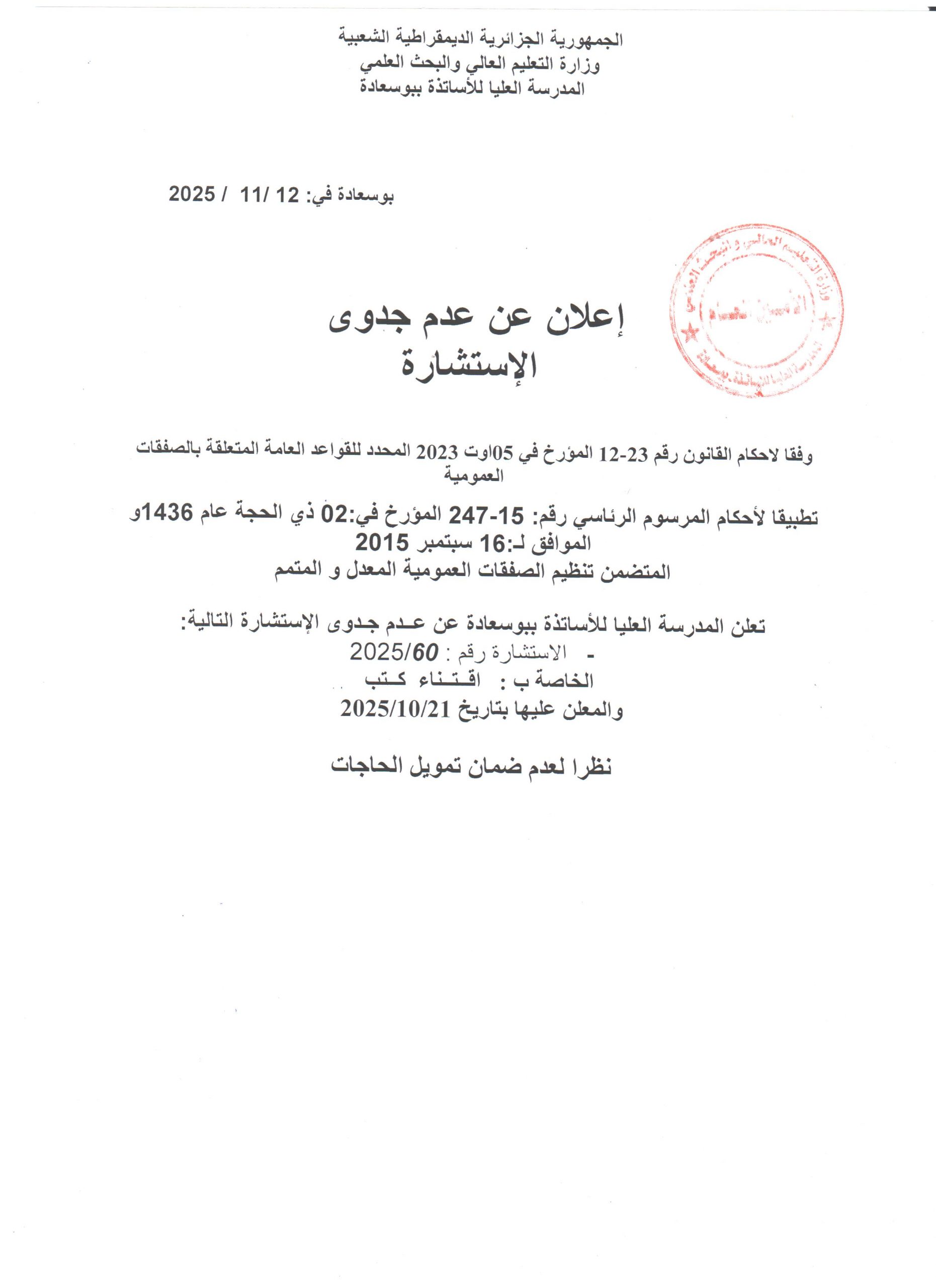 منح مؤقت : إستشارة رقم 69 : إقتناء كتب إستشارة رقم 68 : اقتناء قطع غيار سيارات الحظيرة إستشارة رقم 67 : إقتناء عتاد الاعلام الالي ومستهلكاته لمختلف مخابر البحث المتعلقة بالبحث العلمي والتطوير التكنولوجي الألي إستشارة رقم 66 : خدمات التأمين للممتلكات و العقارات لسنة 2026 إستشارة رقم 65 : خدمات الحراسة و الأمن لسنة 2026 إستشارة رقم 64 : خدمات النظافة و التطهير لسنة2026 إستشارة رقم 63 : اقتناء اعتاد الاعلام الالي ومستهلكاته لمختلف المخابر المتعلقة بالبحث العلمي والتطوير التكنولوجي إستشارة رقم 62 : اقتناء الأثاث و الأدوات و المعدات العلمية لمختلف المخابر المتعلقة بالبحث العلمي و التطوير التكنولوجي إستشارة رقم 58 : اقتناء اعتاد الاعلام الالي ومستهلكاته لمختلف المخابر المتعلقة بالبحث العلمي والتطوير التكنولوجي إستشارة رقم 56 : اقتناء مواد الصيانة والنظافة إستشارة رقم 55 : اقتناء عتاد الصيانة والاصلاح إستشارة رقم 54 : اقتناء عتاد طبي إستشارة رقم 53 : جلب اشجار للمساحات الخضراء إستشارة رقم 52 : اقتناء عتاد السمع البصري إستشارة رقم 51 : اقتناء عتاد واثاث المكتب إستشارة رقم 48 : اقتناء مستهلكات الاعلام الالي إستشارة رقم 47 : اقتناء عتاد الاعلام الالي إستشارة رقم 46 : اقتناء البسة العمال إستشارة رقم 45 : خدمات تكوين موظفين وتحسين المستوى إستشارة رقم 44 : : صيانة وتصليح عتاد البيداغوجيا إستشارة رقم 43 : اقتناء مواد ولوازم صيدلانية وكيميائية إستشارة رقم 42 : اقتناء مستهلكات المخابر اعلان-مسابقة-معمارية-رقم-01-2025 إستشارة رقم 39 : خدمات الإستقبال لمصاريف التسيير المتعلقة بالبحث العلمي و التطوير التكنولوجي إستشارة رقم 38 : خدمات الإيواء لمصاريف التسيير المتعلقة بالبحث العلمي و التطوير التكنولوجي إستشارة رقم 37 : خدمات الإطعام لمصاريف التسيير المتعلقة بالبحث العلمي و التطوير التكنولوجي إستشارة رقم 36 : خدمات الإيواء لمختلف التظاهرات العلمية و التقنية لسنة 2025 إستشارة رقم 35 : خدمات الإطعام لمختلف التظاهرات العلمية و التقنية لسنة 2025 إستشارة رقم 31 : الدعم الإمدادي لمختلف التظاهرات العلمية لسنة 2025 إستشارة رقم 30 : خدمة الطباعة و الإستنساخ لسنة 2025 إستشارة رقم 28 : إقتناء مختلف الرايات الوطنية لسنة 2025 إستشارة رقم 27 : اقتناء الاوراق و لوازم التدريس لسنة 2025 إستشارة رقم 26 : اقتناء الاوراق و لوازم المكتب لسنة 2025 إستشارة رقم 23 : إقتناء تذاكر السفر (الطائرة) 2025 إستشارة رقم 20 : اقتناء عتاد ومستهلكات النسخ و التصوير 2025 إستشارة رقم 19 : اشغال التهيئة لقاعة المحاضرات بالمدرسة العليا 2025 إستشارة رقم 18 : اقتناء تذاكر سفر ( الطائرة ) 2025 إستشارة رقم 17 : صيانة و تصليح عتاد الاعلام الالي 2025 إستشارة رقم 16 : صيانة و تصليح الاجهزة العلمية 2025 إستشارة رقم 15 : صيانة و تصليح عتاد النسخ و التصوير 2025 إستشارة رقم 14 : صيانة و تصليح عتاد السمع البصري 2025 إستشارة رقم 13 : نقل الطلبة لمختلف النشاطات للنوادي العلمية 2025 إستشارة رقم 12 : جوائز لمسابقات و التظاهرات 2025 إستشارة رقم 11 : لوازم لمختلف النشاطات الثقافية 2025 إستشارة رقم 10 : اقتناء مختلف اللوازم الرياضية 2025 إلغاء المنح مؤقت : إستشارة رقم 58 : اقتناء عتاد الاعلام الآلي و مستهلكاته لمختلف المخابر المتعلقة بالبحث العلمي عدم جدوى : إستشارة رقم 61 : اقتناء عجلات لحضيرة المدرسة إستشارة رقم 60 : اقتناء الكتب إستشارة رقم 59 : اقتناء االلوازم بما فيها المكونات الالكترونية والسمعية البصرية ومستلزمات و احتياجات المخابر المتعلقة بالبحث العلمي والتطوير التكنولوجي إستشارة رقم 57 : اقتناء الاثاث والعتاد والادوات والمعدات العلمية لمختلف المخابر المتعلقة بالبحث العلمي والتطوير التكنولوجي إستشارة رقم 50 : إقتناء عتاد السمعي البصري لسنة 2025 إستشارة رقم 49 : إقتناء عتاد و أثاث مكتب لسنة 2025 إستشارة رقم 34 : خدمات تكوين الموظفين و تحسين المستوى المهني لسنة 2025 إستشارة رقم 33 : إقتناء عتاد السمع البصري 2025 إستشارة رقم 32 : صيانة و تصليح أثاث 