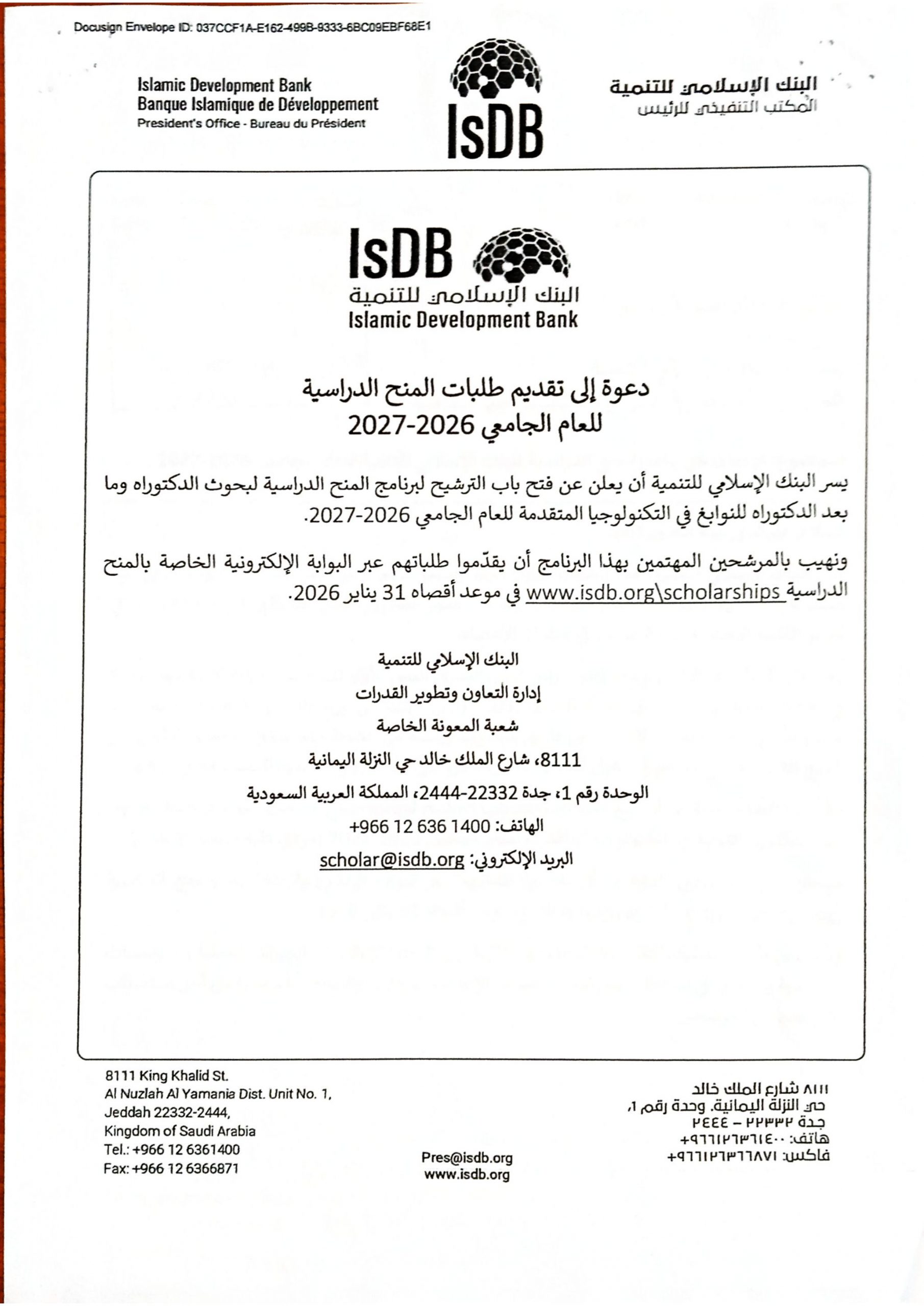 الإعلان عن برامج المنح الدراسية للبنك الإسلامية للتنمية للعام الجامعي 2026-2027 عرض 100 منحة دراسية في الاطوار الجامعية الثلاثة بكازاخستان 2025 عرض منحة رومانيا:من جامعة Pitesti University للعام الدراسي 2025 عرض منحة سيول: منح الدكتوراه في تخصصات مختلفة للعام الدراسي 2025 عرض المنحة الدراسية من المملكة العربية السعودية « deux programmes de bourses « UI Great » et « UI Shine عرض برنامج منح من قبل منظمة الأغذية والزراعة FAO بالمجر